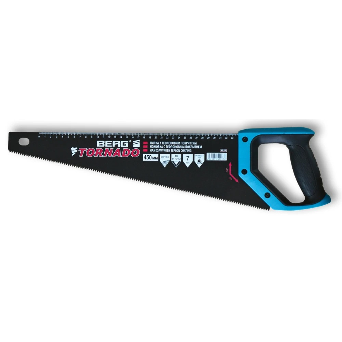 Пилка по дереву. Товщина спеціального тефлонового покриття Berg складає 0,2 мм, товщина робочого полотна 1,1 мм. На полотно нанесена мірна шкала та основні характеристики. Зуби розведені та мають 3-х гранну заточку, що дозволяє пиляти в обох напрямках. Висота зуба 3 мм, кроком 7 шт./1 дюйм. Оснащена ергономічною ручкою (ударостійкий пластик ABS і гума TPR) закритої форми, котра добре підходить для нижнього, середнього та високого хвату, а завдяки її формі можна відмічати кути в 90 та 45 градусів. Призначена для поздовжнього і поперечного швидкого розпилу заготовок з деревини м“яких і твердих порід, ДСП, фанери.